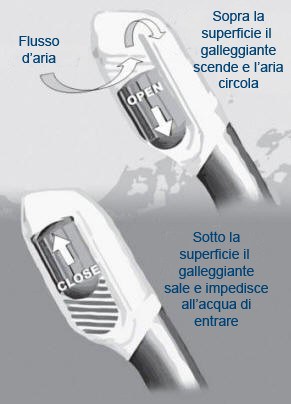 Quando la punta del respiratore scende sotto il livello dell’acqua un piccolo galleggiante dentro il Dry Top sale verso l’alto sigillando lo snorkel